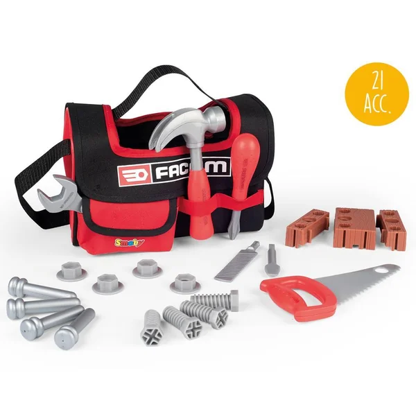 Inclus : 4 outils (1 marteau, 1 tournevis, 1 scie, 1 clé plate), 4 vis, 4 clous, 4 écrous, et des planches de construction.