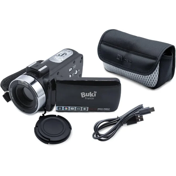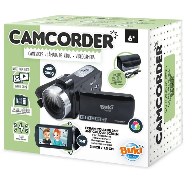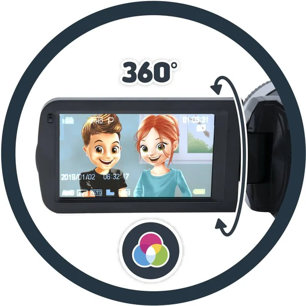 Le caméscope est compact, léger (300g) et facile à prendre en main grâce à sa poignée ajustable. L’écran couleur HD de 7,5cm de diagonale est rotatif ce qui permet de tourner l’écran mais aussi de passer en mode selfie. Le caméscope est doté d’un zoom X16. L’enfant peut connecter le caméscope à un ordinateur pour l’utiliser comme une webcam. Un flash d’appoint est inclus pour améliorer la qualité des vidéos dans l’obscurité. Une carte SD de 16 Go fournie pour filmer jusqu’à 45 minutes en 1080p. La qualité des photos peut aller jusqu’à 24 mégapixels. Le menu du caméscope permet de sélectionner les différentes résolutions. Inclus : une carte SD de 16 Go, une pochette, une sangle et un câble USB-C de chargement et de transfert.