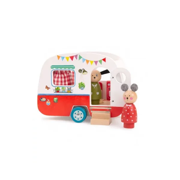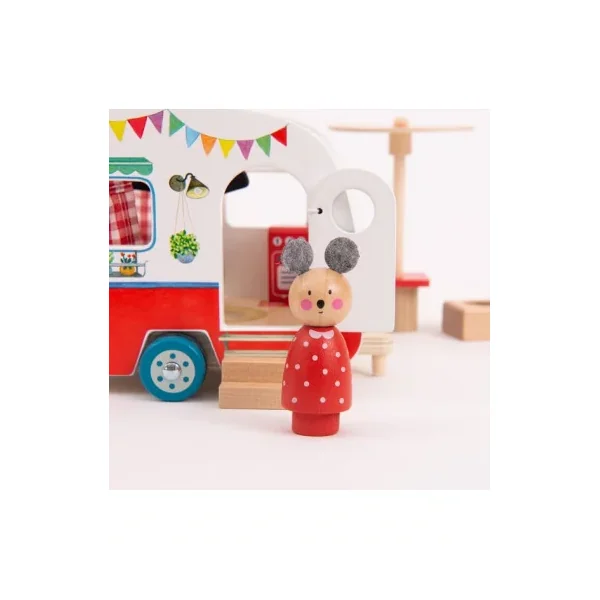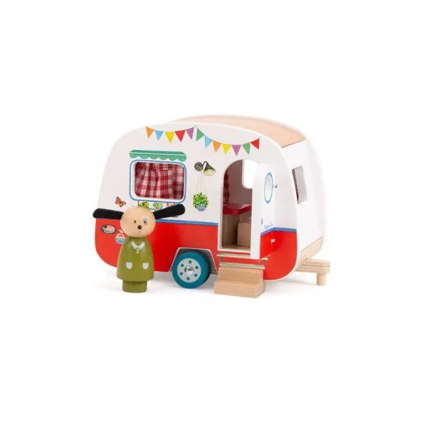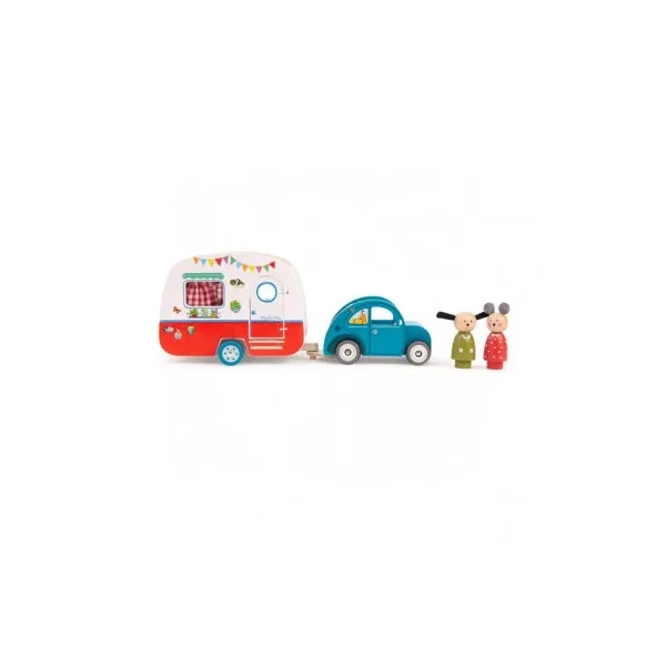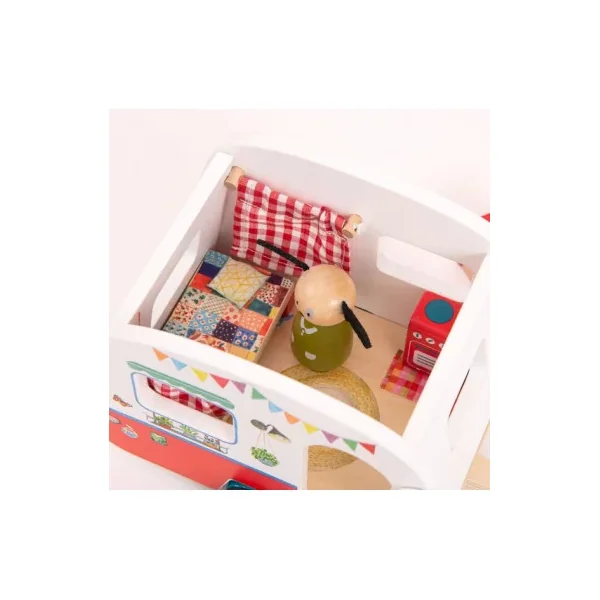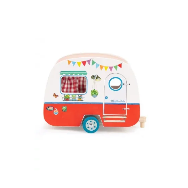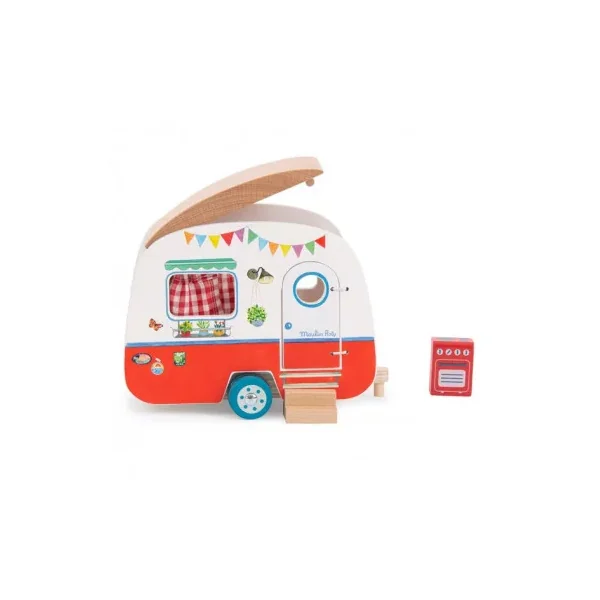 Découvrez la caravane de la collection La Grande Famille de Moulin Roty, un jouet en bois permettant aux enfants, dès 3 ans, d’inventer de belles histoires sur le thème des vacances.