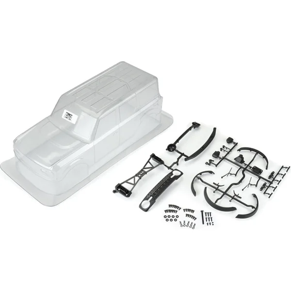 Carrosserie Pro-Line transparente Ford Bronco 2021, pour modèles RC de voitures Crawler à l’échelle 1:10, empattement 313mm, longueur 463mm, largeur 217mm. Fabriquée en lexan résistant. Comprend une calandre en plastique noir moulé, des ailes, des rétroviseurs, des poignées de porte, des essuie-glaces et un support de roue de secours.