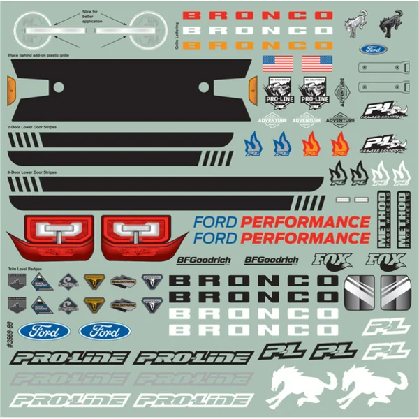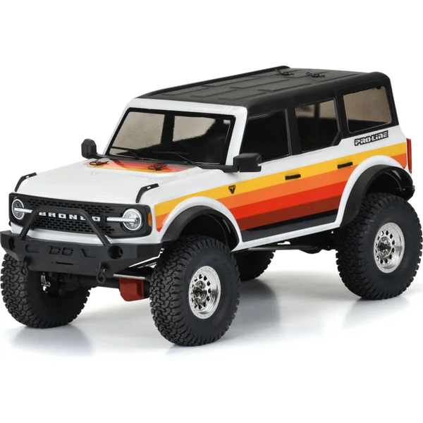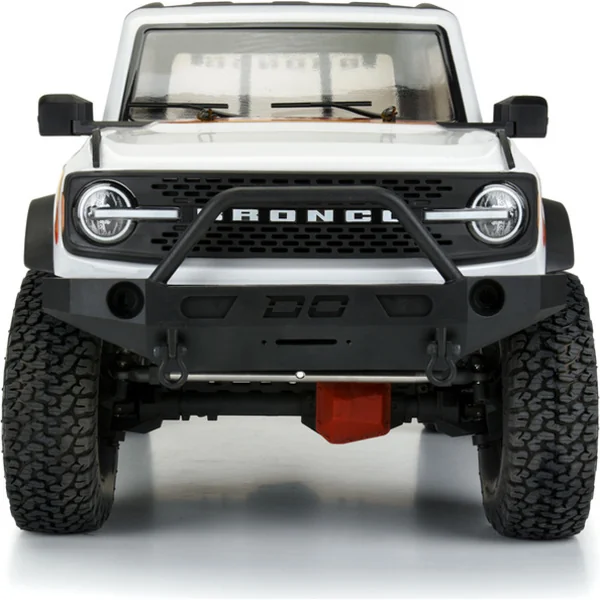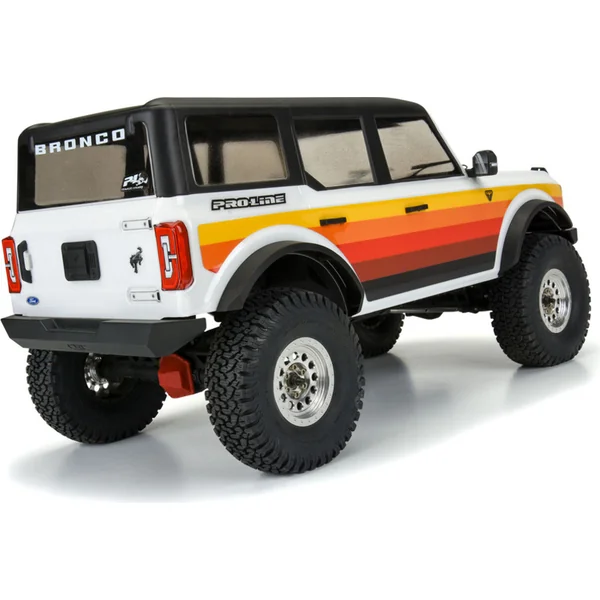 Pro-Line propose la carrosserie Ford® Bronco 2021 avec un empattement de 313mm pour des roues classiques ou des châssis à chenilles, équipée d’une calandre avant, de phares, de bandes de carrosserie et de nombreux détails. La feuille de décalcomanies comprend des lumières, des poignées, des logos et des inscriptions. La carrosserie est transparente et comprend un masque de fenêtres. Après peinture, appliquez les décalcomanies et c’est prêt. Pro-Line a encore élevé la barre pour les détails des accessoires sur la carrosserie en polycarbonate, y compris la calandre en plastique noir moulé, les ailes, les rétroviseurs, les poignées de porte et les essuie-glaces. Le support de roue de secours vous permet de monter un pneu de secours à l’arrière, tandis que les supports de phares avant et arrière permettent l’éclairage LED (vendu séparément).
