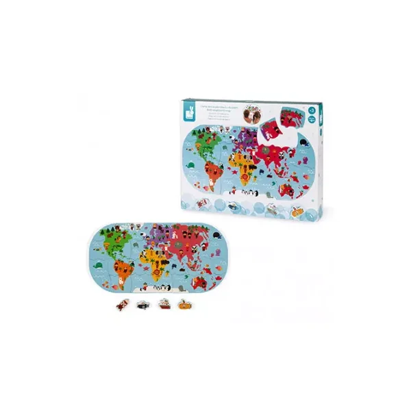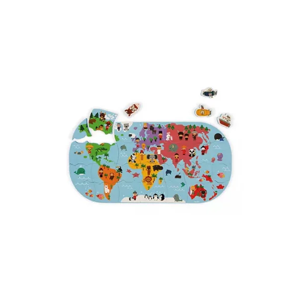 Votre enfant va s’amuser à assembler les pièces du puzzle afin de reconstituer le monde et jouer avec les 4 figurines véhicules pour circuler à travers le monde, dans les airs ou sous la mer.