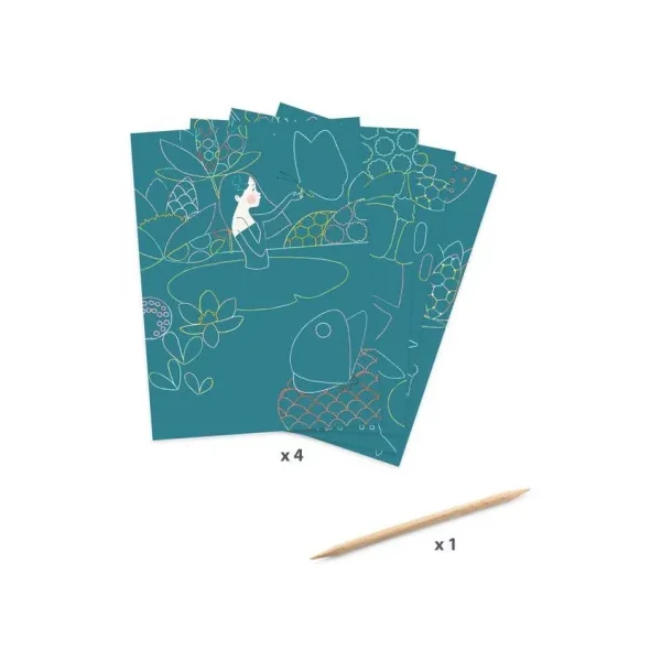 La pochette contient 4 cartes à gratter, 1 stylet en bois double pointe et un livret explicatif pas à pas en couleurs.
