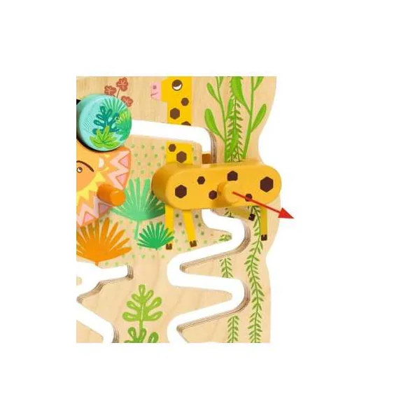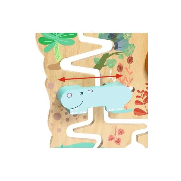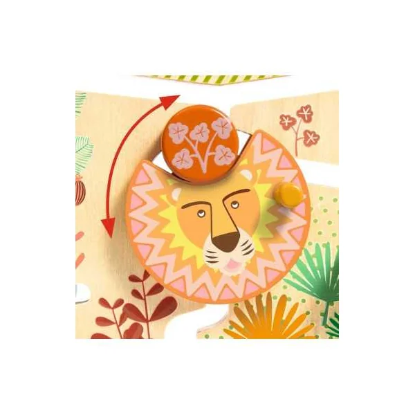 Après avoir choisi un palet, l’enfant le place dans l’une des 3 entrées en haut de la cascade pour le voir ensuite glisser vers le bas. En milieu de parcours, 3 animaux retiennent les palets. Pour les libérer, votre enfant devra tourner le lion, tirer sur la girafe ou décaler l’hippopotame afin que les palets puissent finir leur course. Les palets se déplacent lentement pour laisser le temps à l’enfant d’observer la descente.
