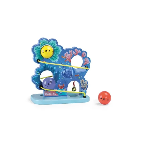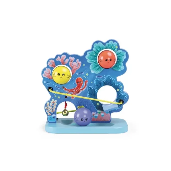 Bienvenue dans les fonds coralliens avec cette cascade en bois aux couleurs de l’océan! Bébé va adorer faire dévaler les 3 boules à l’effigie de petits poissons qui feront tinter la clochette à l’arrivée.