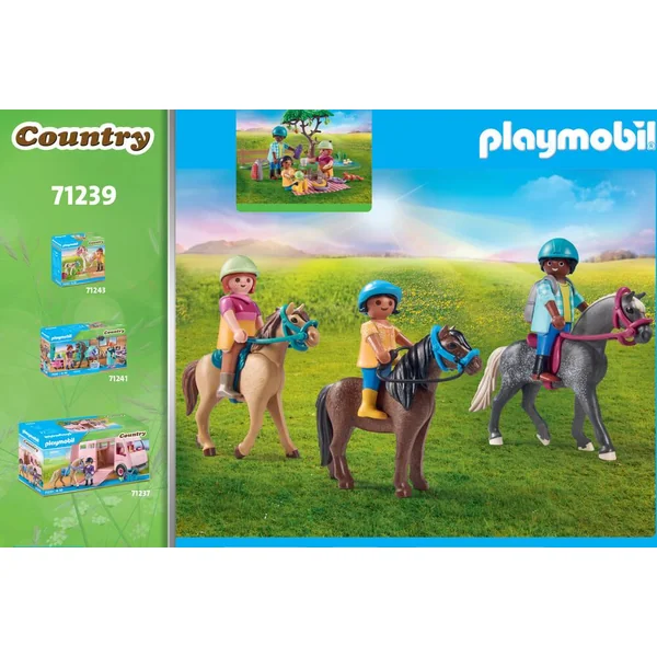 Une famille en promenade à cheval – Une nappe à carreaux et tout le nécessaire à pique-nique – Contient 3 personnages, 3 chevaux, un chien, 2 écureuils et des accessoires (petit point d’eau, arbres, nécessaire de pique-nique…) 67 pièces.