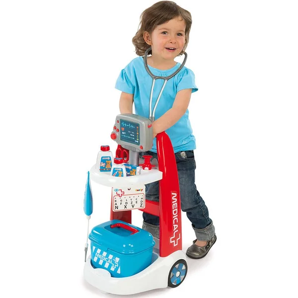 Le chariot idéal pour jouer au médecin, avec des accessoires super réalistes ! Inclus : 2 Flacons, un seringue, un thermomètre, deux boites de pansements avec des pansements, ciseaux, un otoscope, deux cartes, un stéthoscope, un marteau de réflexe, un thermomètre, une paire de lunettes et un vanity. Il est également muni d’un équipement électronique avec sirène et appareil de mesure de l’état de santé et des battements de cœur du patient.