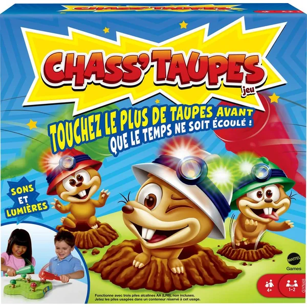 Conçu par Mattel, Chass’taupes est non seulement amusant, mais aussi éducatif, aidant les enfants à développer des compétences essentielles dans un contexte ludique. Trois piles LR6 sont nécessaires pour faire fonctionner le jeu, mais elles ne sont pas incluses avec le produit.