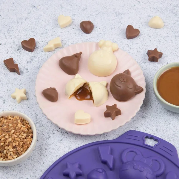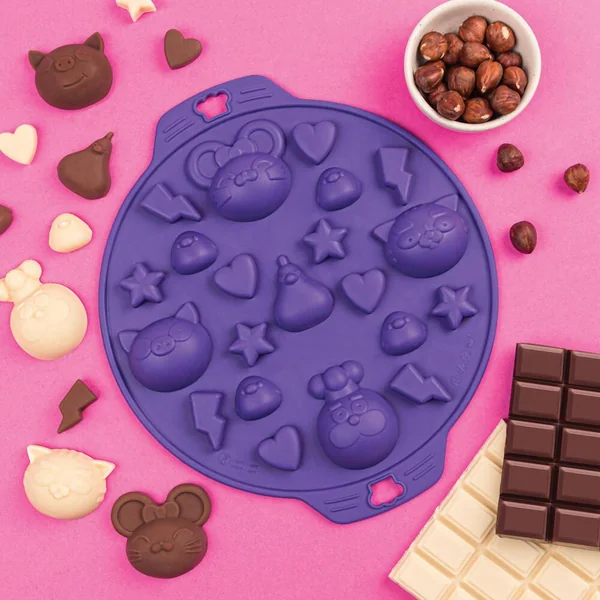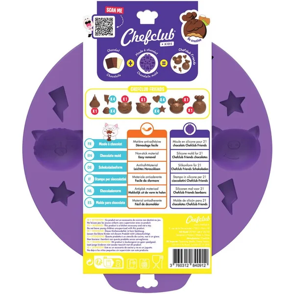 Ce moule permet aux petits et grands de réaliser 21 délicieux chocolats à l’effigie des Chefclub Friends. Place à la créativité, chocolat blanc, lait, noir, praliné, noisettes, caramel, bonbons, tout est possible ! Le moule est en silicone pour un démoulage et un entretien facile. Un moule pour réaliser 21 gourmandises suivant ses envies . Démoulage pratique grâce au silicone antiadhésif ! Résiste aux températures entre 40 °C et 230 °C. Multifonction : chocolats, bonbons, glaçons, beurres, savons, etc.