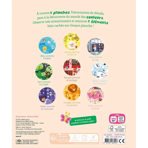 À travers 9 planches foisonnantes de détails, les petits partent à l’exploration des couleurs ! Ils observent attentivement et retrouvent 7 éléments (+ la mascotte) bien cachés sur chaque planche. Les 9 univers :