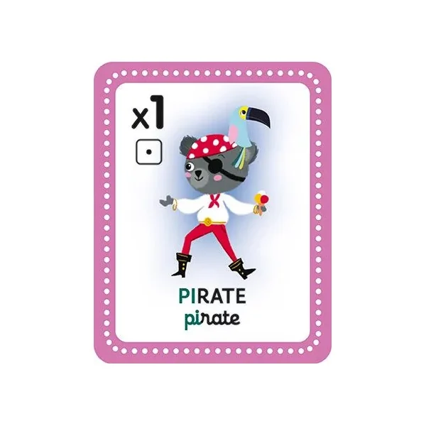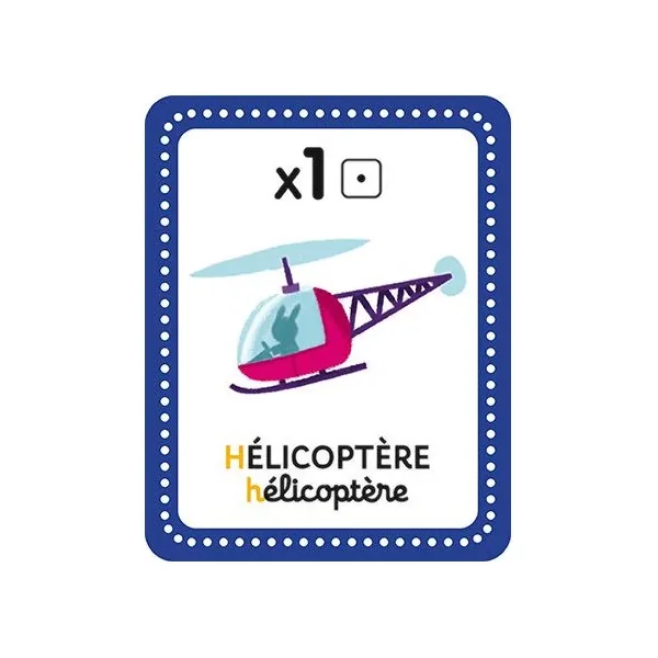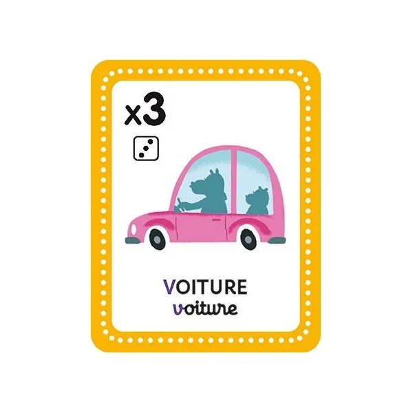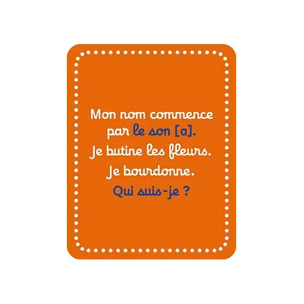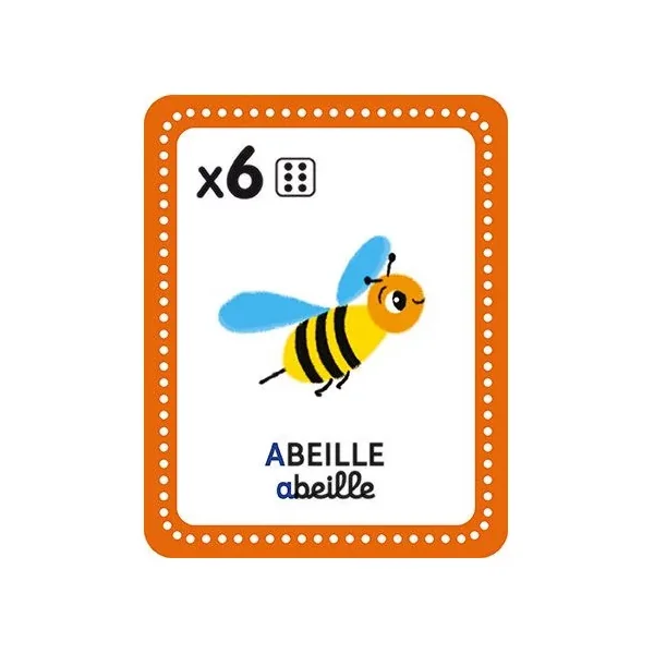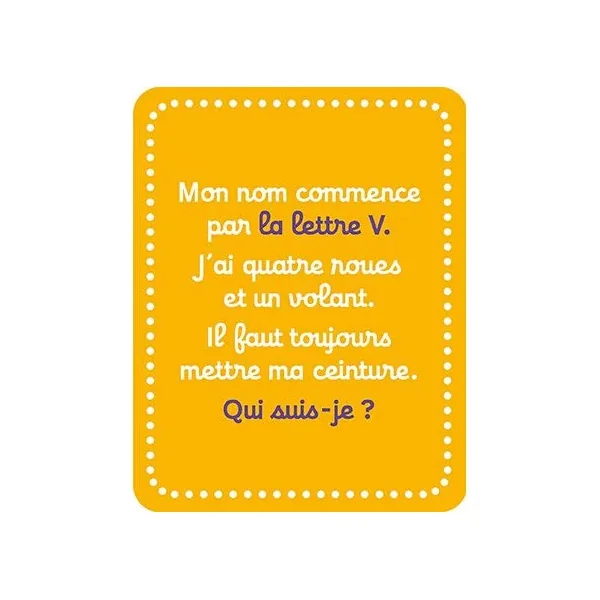 L’enfant pioche une carte du paquet. Sur le recto de la carte, figure une lettre et une devinette (ex : « J’ai deux ailes et je vole dans le ciel! Qui suis-je ? »). Avec l’aide des autres joueurs, il doit répondre à la question et nommer la lettre qui commence le mot. La réponse est illustrée au verso de la carte (ex : « l’avion »). Et il est indiqué combien d’avions il faut trouver sur le plateau de jeu (ex : « X2 »). Dans ce jeu de société, il n’y a pas de perdant, pas de gagnant, tout le monde cherche ensemble.