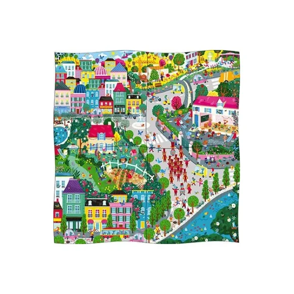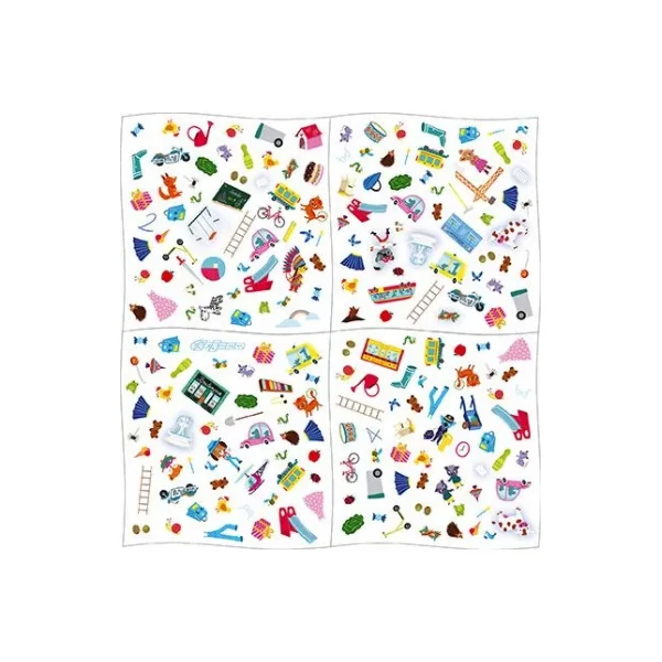 Ce jeu éducatif contient un grand plateau de jeu (50 x 52 cm) recto verso avec un pattern avec fond blanc d’un côté et une grande illustration de l’autre, 80 cartes recto verso, 8 jetons et la règle du jeu.