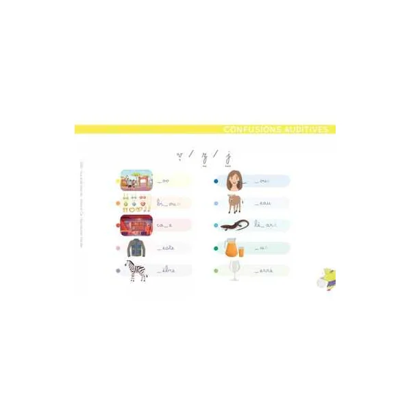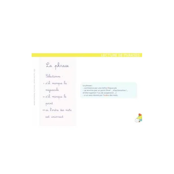 Il propose 50 fiches d’exercices ciblant le développement de la conscience phonologique au niveau des sons, des mots et des phrases, des QR-codes qui renvoient à une version audio des fiches pour une plus grande autonomie et des lettres cursives à tracer avec le doigt pour s’imprégner du bon sens d’écriture.