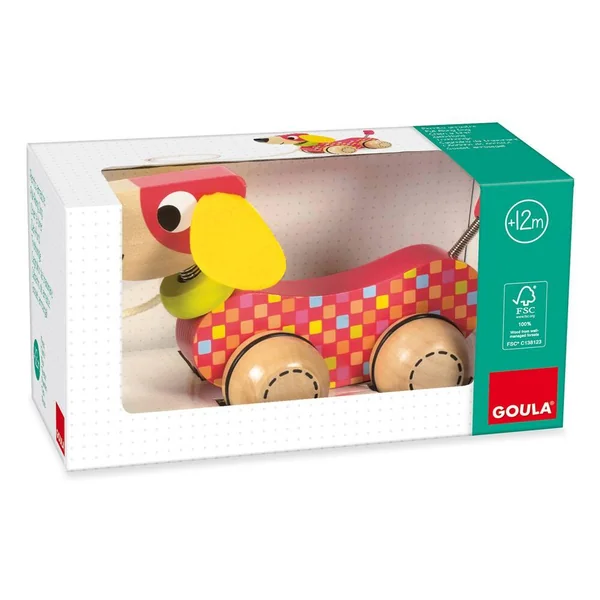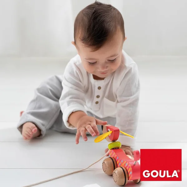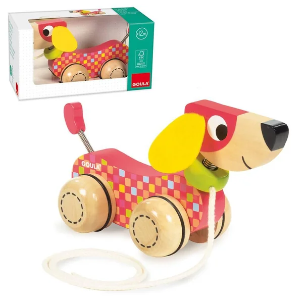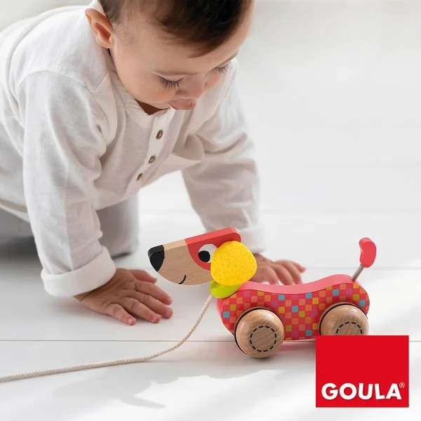En tirant sur la corde, le chien avance et remue la tête et la queue, ce qui stimule bébé.