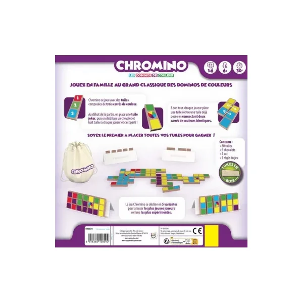 Dans cette alternative idéale aux dominos, placez vos pièces de couleur en contact avec les Chromino déjà posés. Chaque chromino fait 3 carrés de long, chacun de ces carrés pouvant être d’une couleur différente.