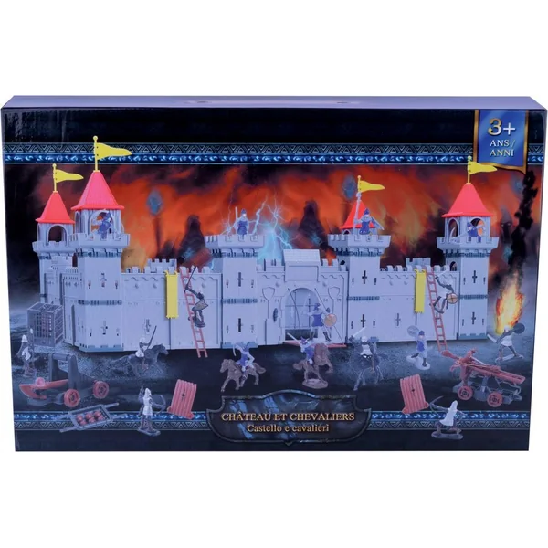 Château à assembler. Avec de nombreux accessoires inclus dont : 16 figurines et 2 machines de guerre. En plastique.