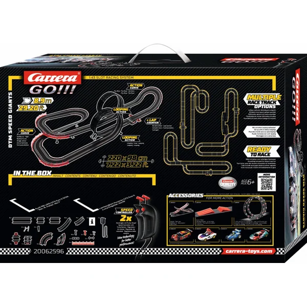 Piste de course Carrera GO!!! – longueur 8,9 m avec des voitures GT3 Audi R8 LMS et Lamborghini Huracán comprend un looping, un virage incliné, un mur perpendiculaire, des lignes droites, des virages, un segment avec compteur de tours et d’autres segments. Assemblez différentes variantes de pistes selon votre imagination. Le plus long set GO!!!