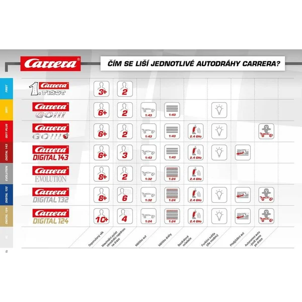 - Le set comprend un segment d’alimentation, un compteur de tours mécanique, 2x manette de vitesse, 2x voiture, barrières, connecteurs de piste, mode d’emploi en slovaque