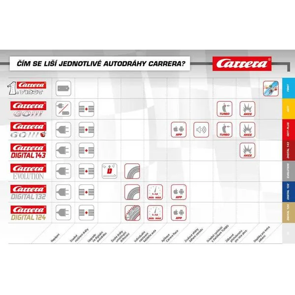 CARRERA signifie course en espagnol et une chose est sûre. Dès que vous ouvrez la boîte avec le logo Carrera, votre sang de course s’accélère à plein régime. Ce sentiment est ressenti par des milliers de fans depuis 1963. Carrera s’est imposée au sommet des pistes de course, des voitures et des accessoires en plus de quarante ans. Aujourd’hui, elle propose des produits de la plus haute qualité, destinés non seulement aux enfants, mais aussi aux adultes, pour qui les pistes de course sont devenues un hobby à vie.