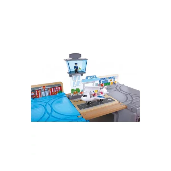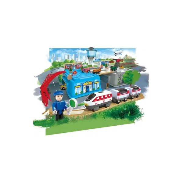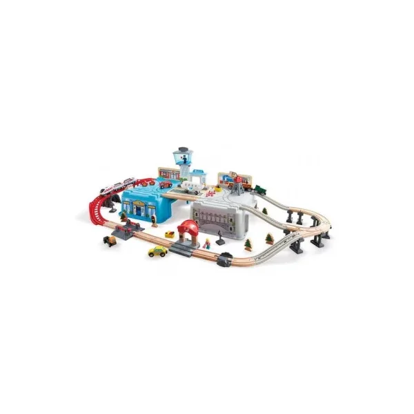 Le coffret comprend 1 boîte avec 1 couvercle, des rails sous différentes formes, 4 décorations en bois, 1 train de marchandises avec 2 wagons, 1 plateforme, 1 tour de contrôle, 1 avion, 1 feu de signalisation, 1 camion de pompiers, 2 blocs de feu, 1 camion, 2 blocs cargo, 1 taxi, 1 grue, 1 passage à niveau, 1 montagne, 8 piliers, 1 locomotive à grande vitesse électrique avec 2 wagons passagers, 2 panneaux de signalisation, 2 figurines, 6 blocs cônes et 2 supports à outils avec 10 outils.