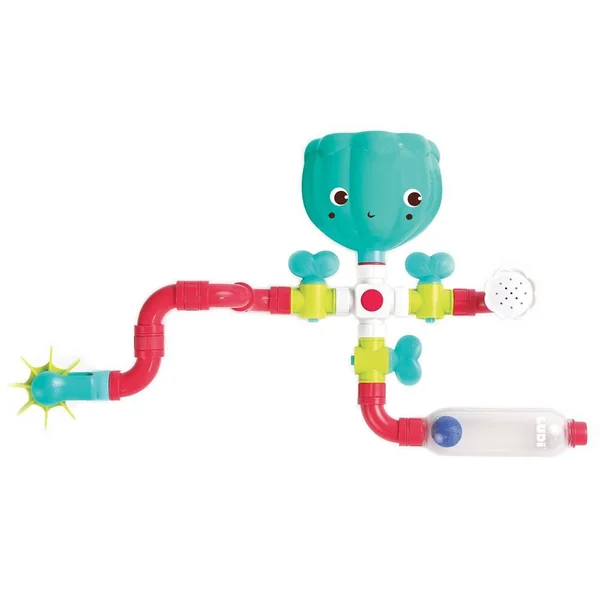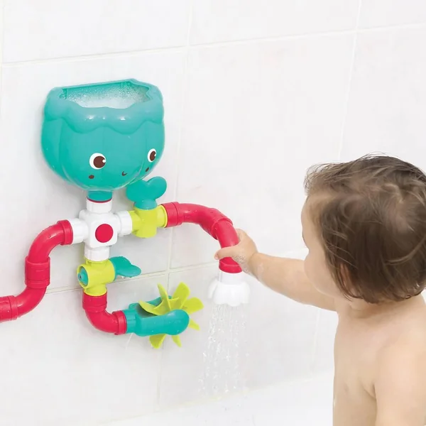 Un grand circuit d’eau rigolo à construire ! Ce jeu de construction aquatique est plein d’astuces pour animer l’heure du bain ! Retrouvez tout un réseau de tuyaux équipés de robinets et de nombreuses activités pour découvrir les effets de l’eau. Il est impossible de s’ennuyer ! Quand l’enfant verse l’eau dans le réservoir et ouvre les robinets, tout le circuit s’active ! Galopin le petit lapin plongeur indique la direction de l’eau qui s’écoule. Bébé s’amusera à regarder la bille monter dans la capsule et indiquer le niveau de l’eau. Il jouera avec l’eau entrainant le moulin et se laissera volontiers arroser par la petite fleur. Accompagnés de leurs parents, les enfants pourront également fermer un des trois robinets pour que l’activité associée cesse de fonctionner. Par le jeu, ils apprendront qu’une action peut en entraîner une autre. Un jeu évolutif. Les 14 pièces sont interchangeables et permettent aux enfants de réaliser leur propre parcours. En grandissant, ils adoreront réfléchir et trouver des installations insolites pour tester leur circuit d’eau. Place à l’imagination ! Ludique, ce jeu rigolo captive le regard des petits. Une belle occasion pour les enfants d’affiner leur dextérité, de développer leur sens de l’observation, la compréhension de cause à effet et leur vocabulaire ! À l’aide des ventouses, il est facile de fixer le circuit sur les parois de la baignoire ou sur le carrelage. Solide et pratique il peut aussi se détacher pour devenir un jouet indépendant. Pensez à bien nettoyer les ventouses et à les fixer sur une surface propre et lisse. Fixé à la paroi de la baignoire, on peut utiliser le jouet dès que bébé tient assis dans un anneau de bain. Contenu du pack : 1 réservoir avec ventouses + 1 connecteur + 3 robinets + 6 tuyaux+ 1 capsule transparente avec bille à niveau + 1 moulin + 1 fleur « pomme d’arrosage » Composition : Acrylonitrile Butadiène Styrène (ABS). Égoutter les jouets après utilisation et rincer/laver à l’eau claire régulièrement.