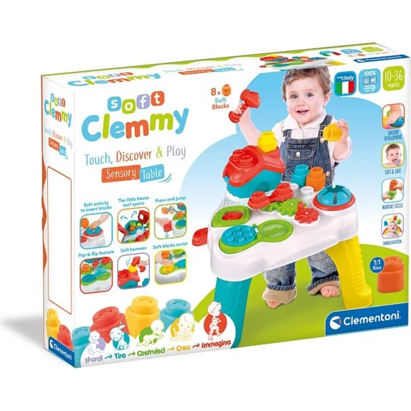 Table d’activités pour des moments pleins de divertissement dans le monde de la douceur… le monde des blocs Clemmy ! La maison constitue un récipient pratique pour les blocs doux et l’ouverture sur le toit est idéale pour les insérer. Parmi les nombreuses activités, il y a un catapulte qui fait « sauter » les blocs Clemmy, tandis que les roues font tourner le manège sur lequel les blocs peuvent être empilés. L’enfant peut utiliser les fentes pour laisser tomber les blocs Clemmy dans les cavités des pieds de la table et ensuite les récupérer, tout en apprenant la relation de cause à effet. La brochure avec des activités pop-it stimule les compétences manuelles de l’enfant, qui peut également jouer avec le catapulte avec un petit marteau « doux » ou insérer plus facilement les blocs Clemmy dans les ouvertures.