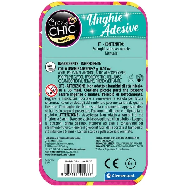 Designed, developed, and manufactured in Italy, the Clementoni Crazy Chic Adhesive Nails reflect a commitment to quality and innovation. The compact packaging, measuring 8.6 x 14.4 x 0.9 cm and weighing just 18 grams, makes it easy to store and transport, ensuring that the fun can go wherever they do.