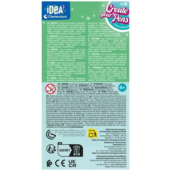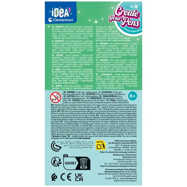 The Clementoni IDEA kit is thoughtfully packed with everything needed to create stunning, customized pens. Inside the box, you will find a variety of pens, colorful inks, charming characters, and all the essential tools required for assembly. This comprehensive collection ensures that children have all the resources they need to bring their imaginative designs to life. Each component is crafted with care, reflecting Clementoni’s commitment to quality and safety in children’s products.