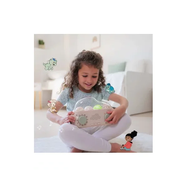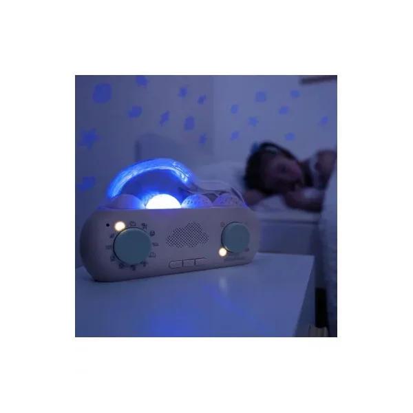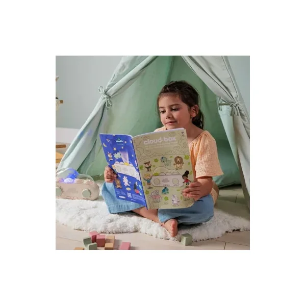 À la fois conteuse à histoires et veilleuse à projections, la Cloud Box est très simple d’utilisation. Elle propose 36 histoires originales et amusantes autour de 9 personnages aux personnalités très différentes. Il y a également 8 mélodies apaisantes et 8 bruits blancs qui créent une atmosphère paisible, ainsi que 4 projections lumineuses synchronisées qui changent à chaque histoire pour créer un spectacle qui donne vie à la narration. Découvrez des univers enchanteurs : Océan, Forêt, Espace et Village.