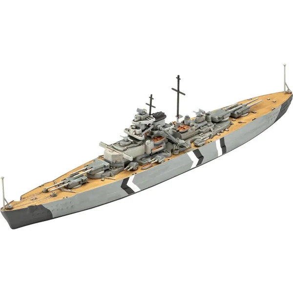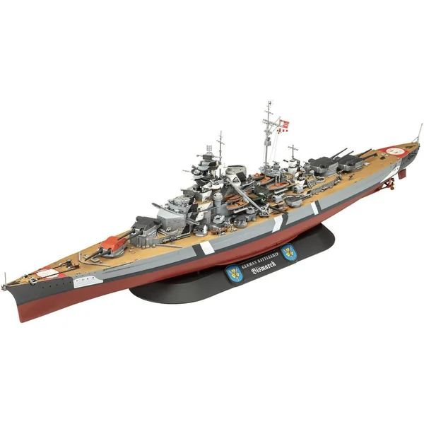 Coffret cadeau du légendaire Bismarck. 2 maquettes plastiques à assembler, à coller et à peindre : 1 à l’échelle 1:700 et 1 à l’échelle 1:1200. 326 pièces. 357 ET 200 mm de longueur. Le coffret cadeau comprend les principales peintures Aqua Color, 1 colle et un pinceau.