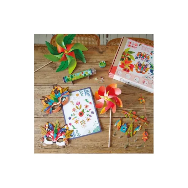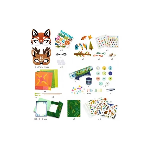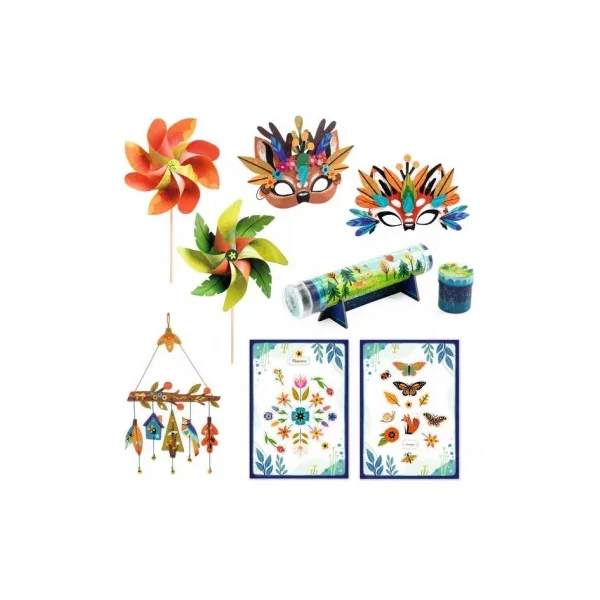 Le coffret comprend 2 masques à décorer avec 80 pièces illustrées en papier, 2 planches de stickers adhésifs double face, 2 élastiques. 2 moulins à vent à fabriquer avec 4 planches illustrées prédécoupées, 2 tiges en bois, 2 embouts en plastique, 1 kaléidoscope à assembler avec 1 tube illustré, 3 miroirs, 1 réceptacle avec couvercle, 1 lentille, 1 petite pince, 11 disques illustrés, 1 boîte de rangement et son assortiment de petits accessoires (50 pièces), 1 socle de rangement illustré, 6 planches naturalistes à créer avec 4 planches d’autocollants (flore, faune), 1 planche d’étiquettes, 1 pochette de rangement à élastiques, 1 carillon à customiser avec 2 planches de décalcomanies, 7 pièces illustrés, du fil de coton coloré, 5 grelots et 1 notice explicative illustrées guidant pas à pas l’enfant dans chacune des activités.