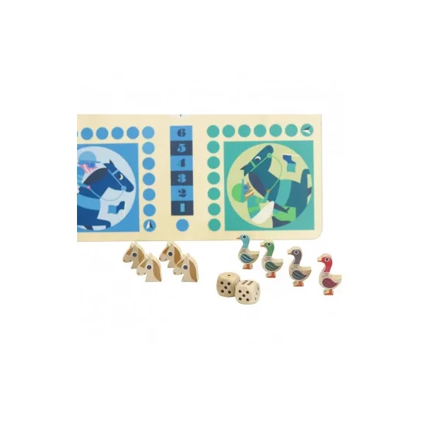 Dans le coffret vous trouverez 4 oies, 16 chevaux, 2 dés et un plateau de jeu réversible.
