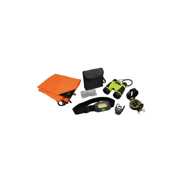 Ce coffret contient un sac à dos, une lampe frontale, une paire de jumelles, une boussole et un podomètre.