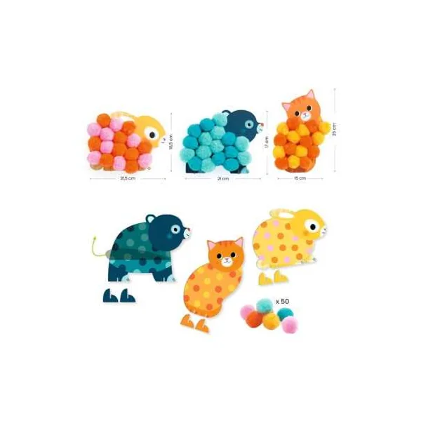 Ce coffret comprend 3 cartes « animal » silhouettées avec une partie autocollante, 50 gros pompons colorés, 6 supports pour maintenir les animaux debout et 1 livret explicatif en couleurs.