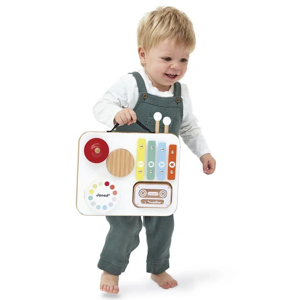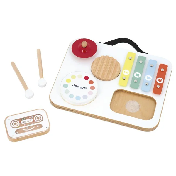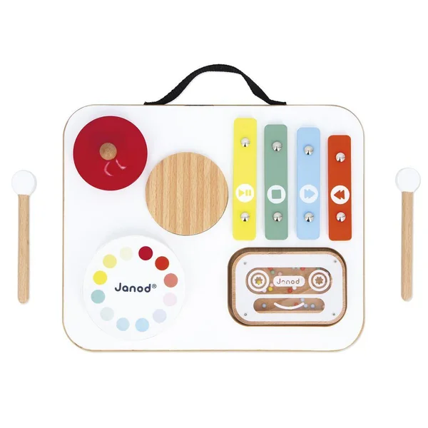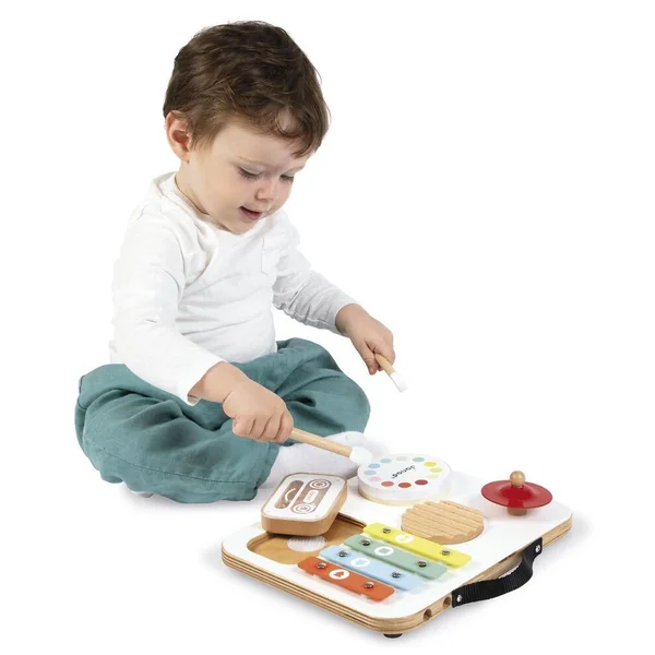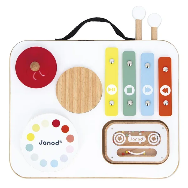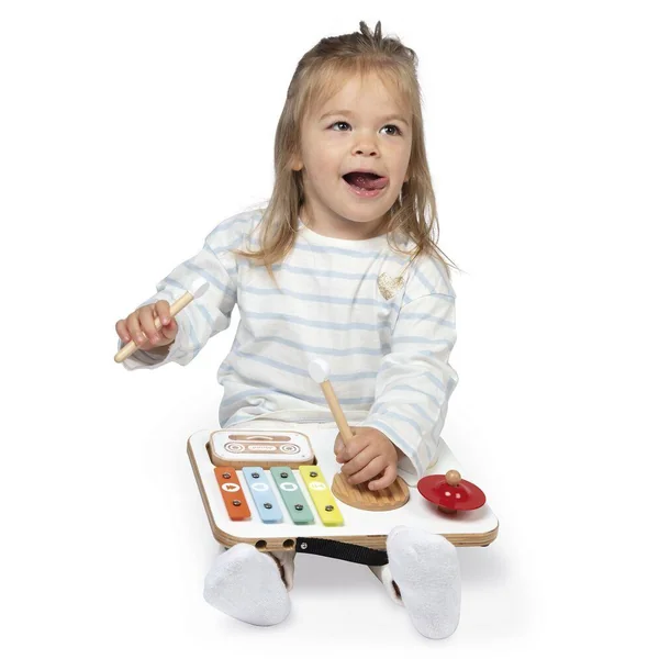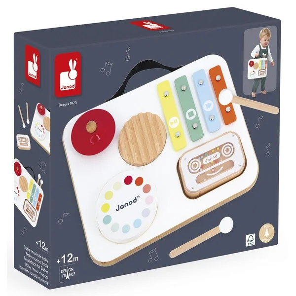 Éveillez la curiosité musicale de vos tout-petits avec cette adorable table musicale en bois signée Janod ! Spécialement concue pour les plus petits, cette table colorée propose 5 activités pour découvrir les sons en s’amusant : gratte-gratte, tambour, cymbale rouge, xylophone multicolore et cassette-hochet remplie de billes. Pratique, les baguettes se rangent sur le dessus de la table, et sa poignée permet de la transporter partout ! Avec ses couleurs vives et ses formes ludiques, elle stimule l’éveil sensoriel, la coordination et l’amour de la musique. Esthétique, solide et parfaitement adaptée aux petites mains. Jouet d’imitation musical en bois FSCT, dès 12 mois.