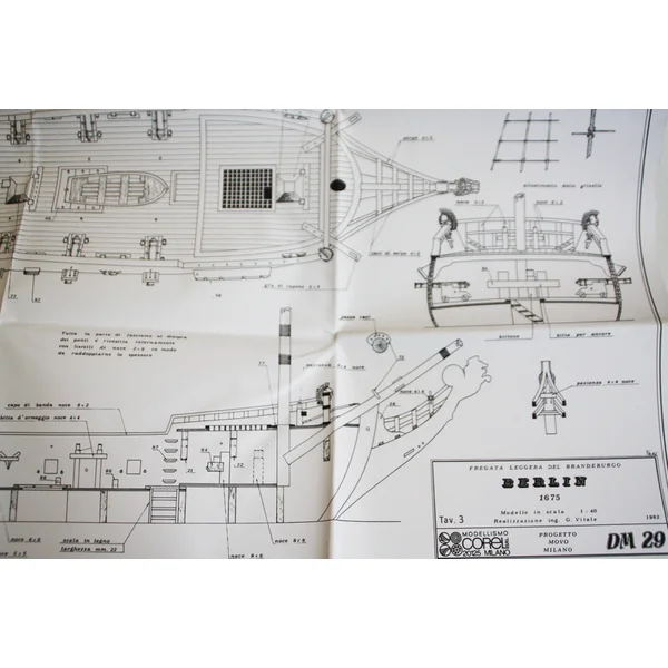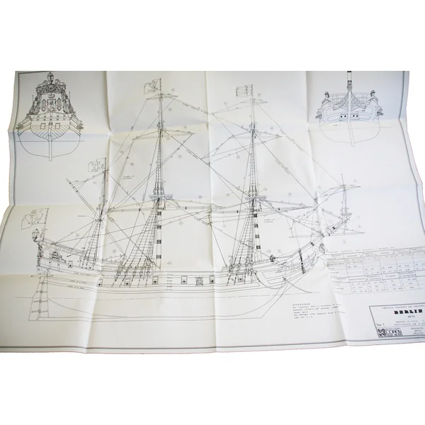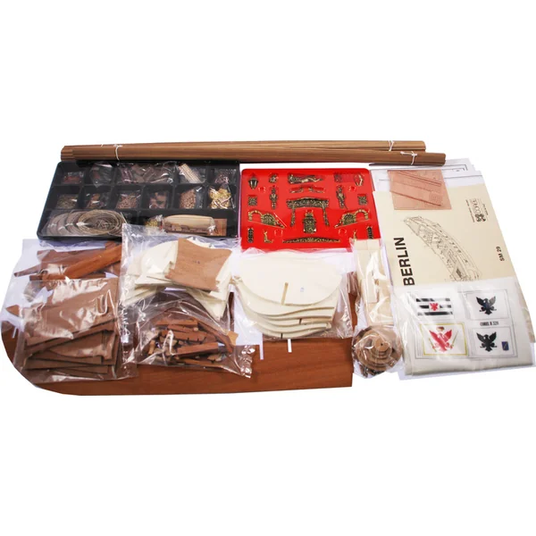 Le kit du modèle non navigant COREL Berlin frégate à l’échelle 1:40 de 1674 a été construit dans le chantier naval de Zeeland pour Friedrich Wilhelm de Brandebourg. Le navire était armé de 6 canons, avec un équipage de 70 hommes. L’emballage contient des pièces en bois, des baguettes et de nombreux accessoires, cordages, toile pour les voiles, plans, etc.