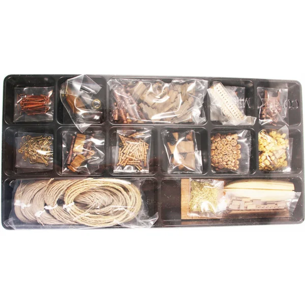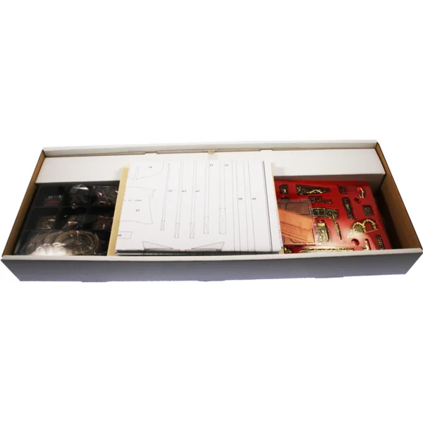 L’emballage contient un ensemble de pièces en contreplaqué, un ensemble de baguettes en bois de différentes sections, un blister avec de petites pièces, des pièces en laiton, un ensemble de dessins et un manuel multilingue.