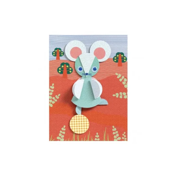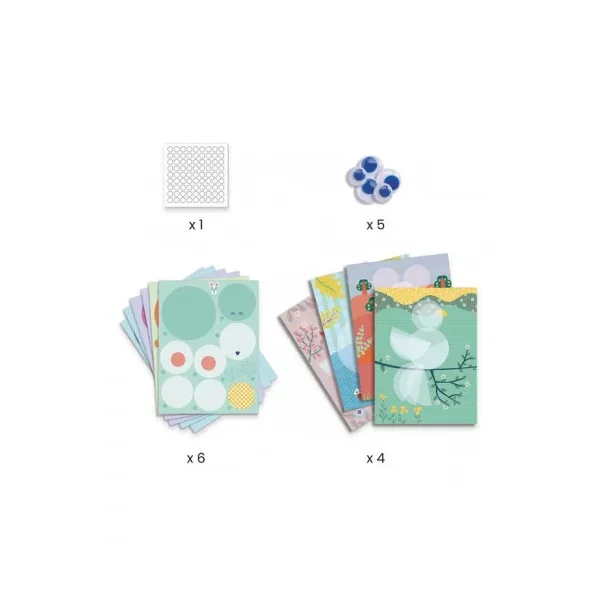 Ce coffret comprend 4 cartes illustrées, 6 feuilles de ronds papier illustrées et prédécoupées en forme de cercle, 5 yeux mobiles, 1 planche d’autocollants double face et 1 livret explicatif en couleur.