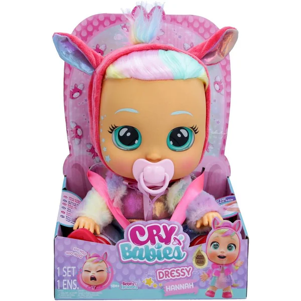 Cry Babies Dressy, sont très réalistes grâce à leurs vrais cheveux et leurs yeux effet cristal ! Ils portent de vrais vêtements et chaussures amovibles; et comme tous les Cry Babies, ils sanglotent et pleurent de vraies larmes lorsqu’on leur enlève leur tétine. Inclus : 1 tenue complète et 1 tétine.