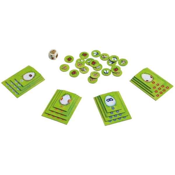 Mais qui donc sort de son oeuf ? Quatre petits oisillons audacieux cassent la coquille de leur ouf et ont déjà très faim. Du coup, la seule solution est de les nourrir, et ce, en grande quantité ! Mais attention, c’est le dé qui déterminera les envies des oisillons et la vitesse à laquelle ils grandissent. Quel sera le premier oisillon à grandir pour devenir un oiseau majestueux ? 2 joueurs. Durée de la partie 15 minutes.
