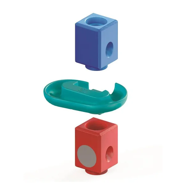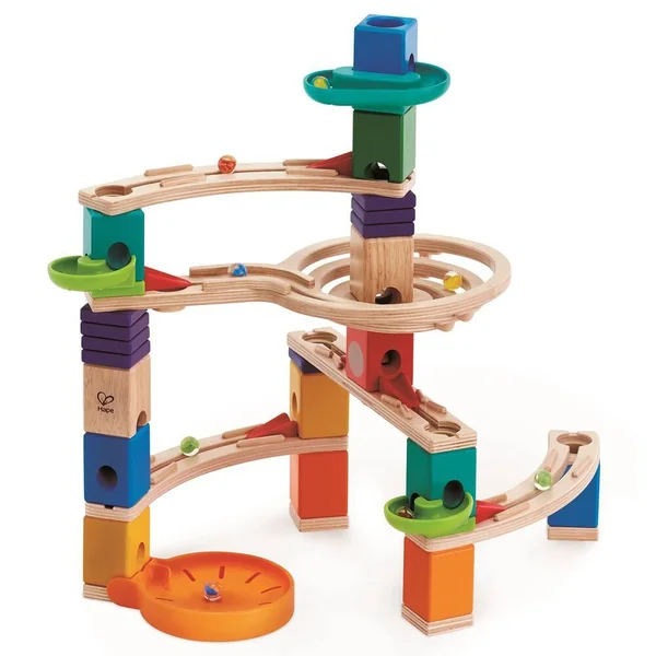 Rapprochez-vous de l’action Quadrilla avec trois gouttières qui permettent à vos billes de passer à l’extérieur des blocs colorés dans leur course efreinée. C’est amusant et ça rallonge la durée de la course