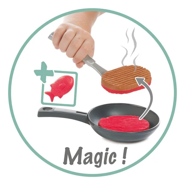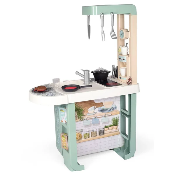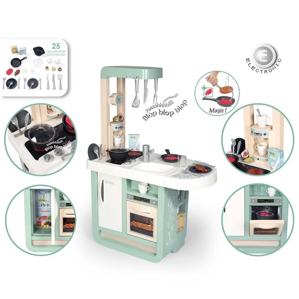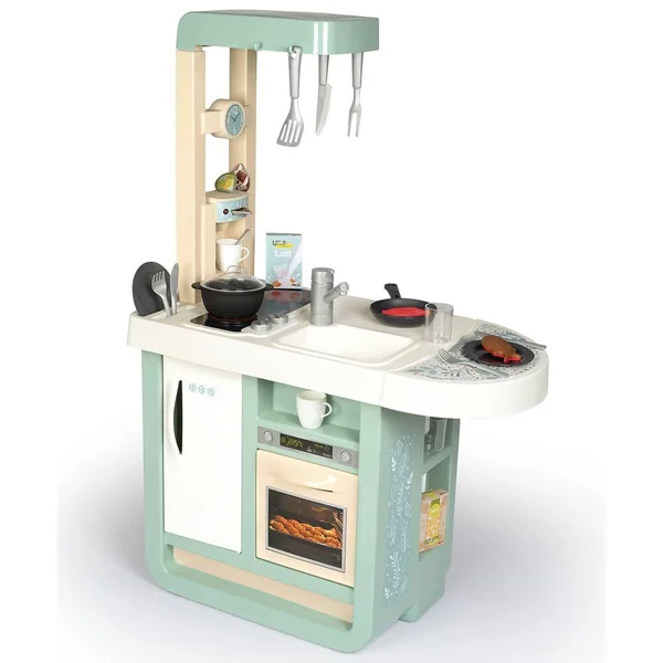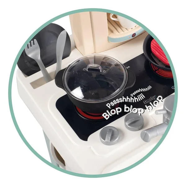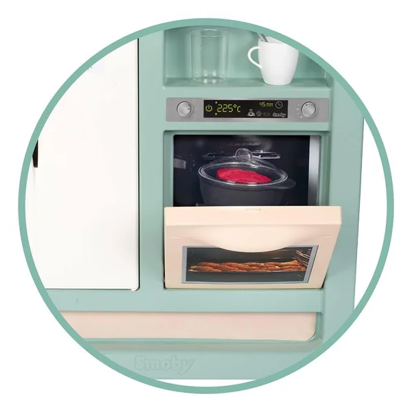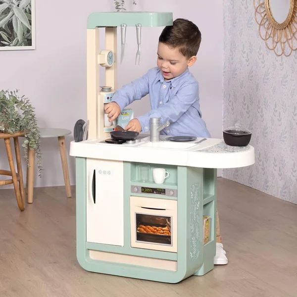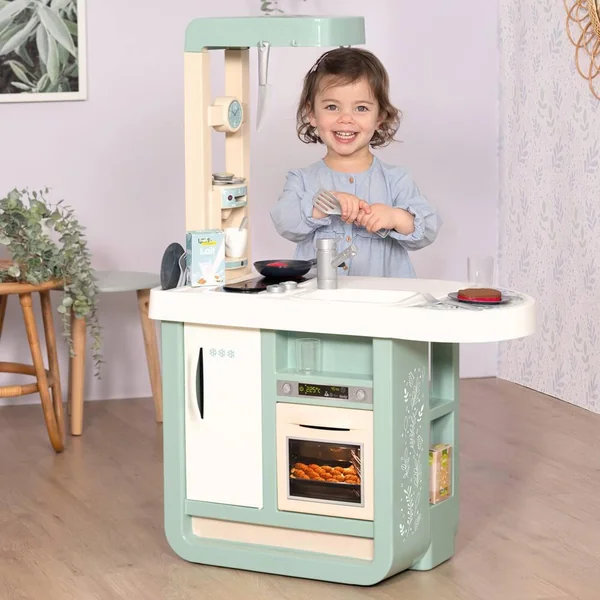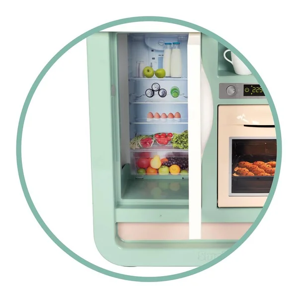 Cuisine au design très contemporain et avec des couleurs douces qui sauront se marier aux intérieurs de tous. Elle est équipée de nombreuses fonctionnalités pour les enfants à partir de 3 ans. Module électronique avec effets sonores (bruits de cuisson). Elle est composée de : 1 plaque de cuisson, 1 évier, 1 hotte, 1 four, 1 frigo, 1 machine à expresso à capsules, 1 plan de travail et de divers rangements. Hauteur du plan de travail : 48.5 cm.