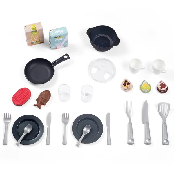 25 accessoires inclus : 3 ustensiles de barbecue, 2 fourchettes, 2 couteaux, 2 cuillères, 2 assiettes, 2 verres, 2 tasses, 3 capsules à café, 1 poêle, 1 faitout, 1 couvercle faitout, 2 boites factices, 1 steak magique et 1 poisson magique.