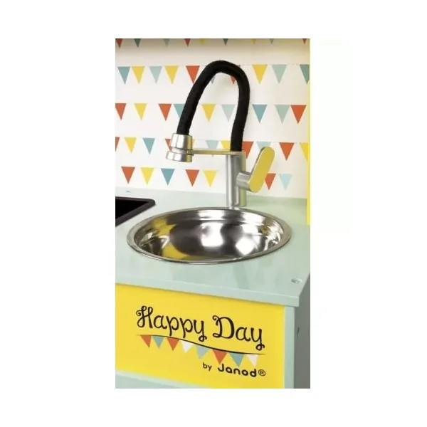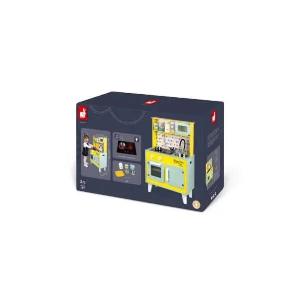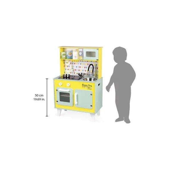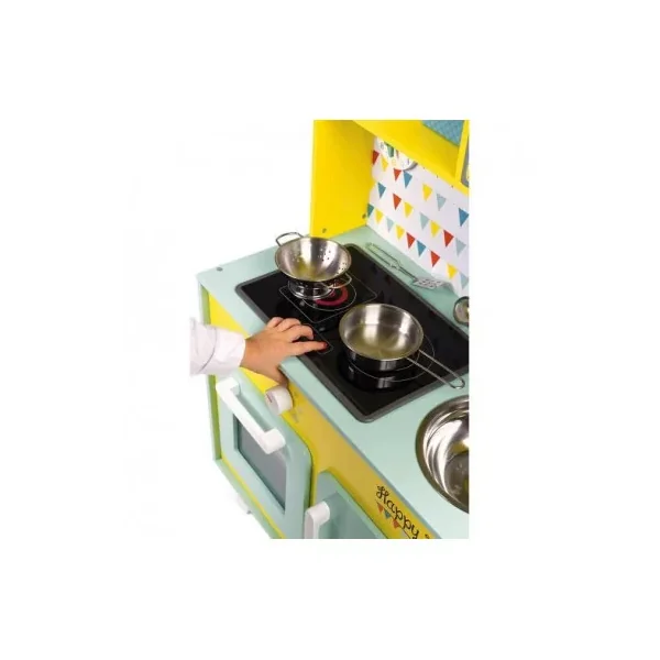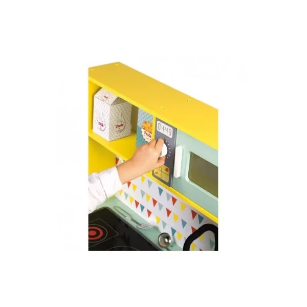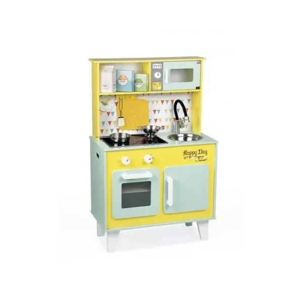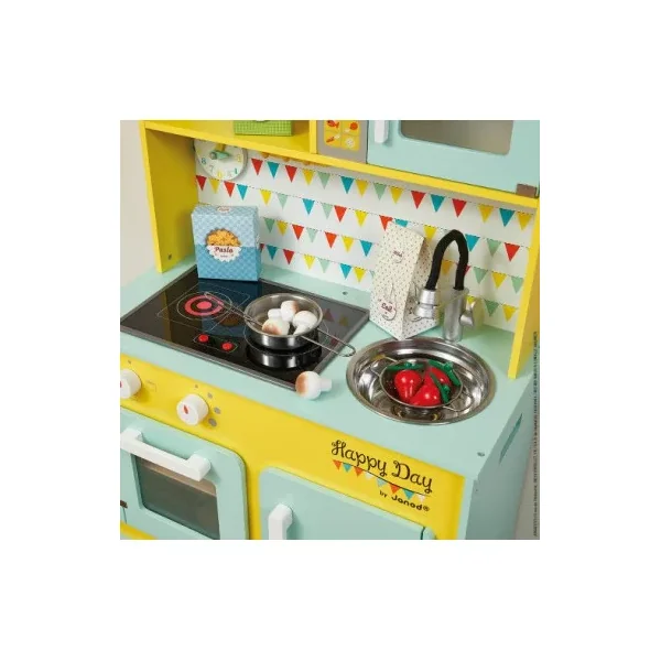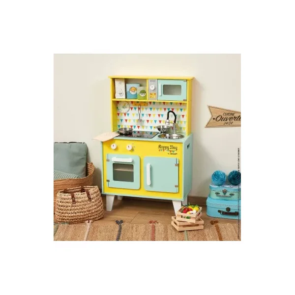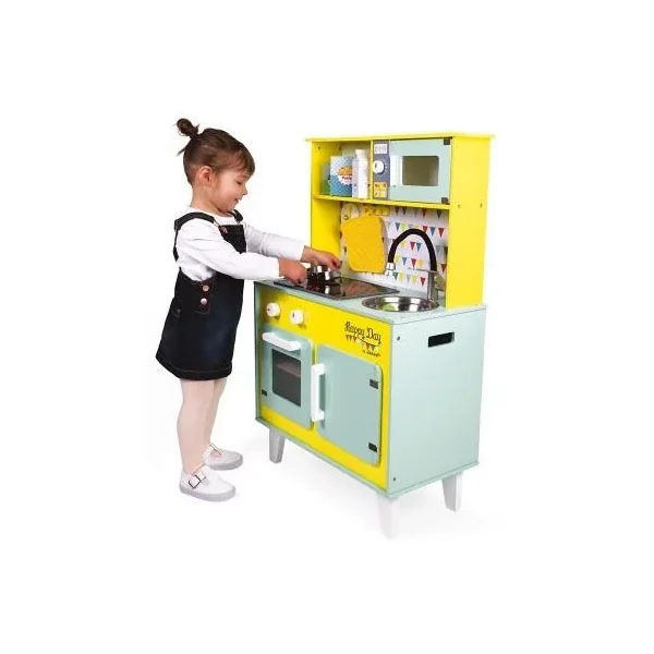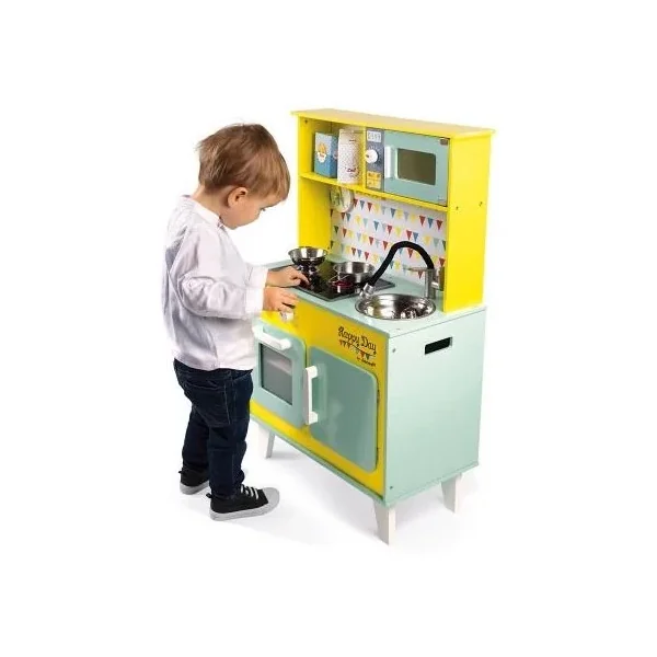 Découvrez la cuisine happy day de Janod, une cuisine colorée toute en bois pour les filles et les garçons qui aiment cuisinier et préparer de bons petits plats. Cette cuisine équipée comprend 7 accessoires pour cuisinier (une poêle, une passoire, une spatule, une manique et 3 boites d’aliments en carton) ainsi que du son et de la lumière. Un cadeau idéal pour les enfants à partir de 3 ans.