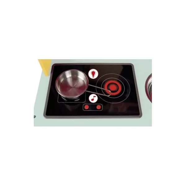 Vous allez aimer sa couleur, sa fonctionnalité et ses équipements: une horloge, une ardoise, une patère pour suspendre les cuillères, un évier en métal, 2 boutons rotatifs avec bruitage et lumières pour allumer les 2 plaques à induction, un four, un micro-onde et un placard avec porte magnétique.