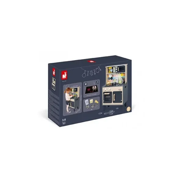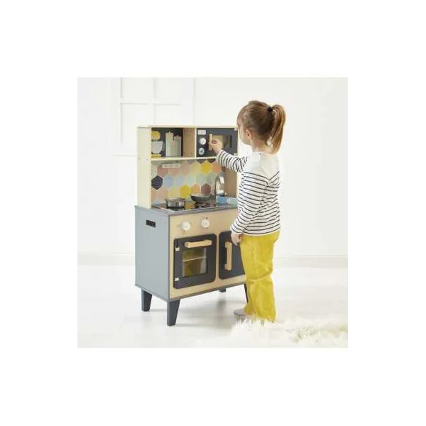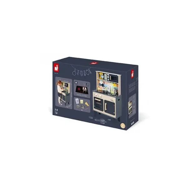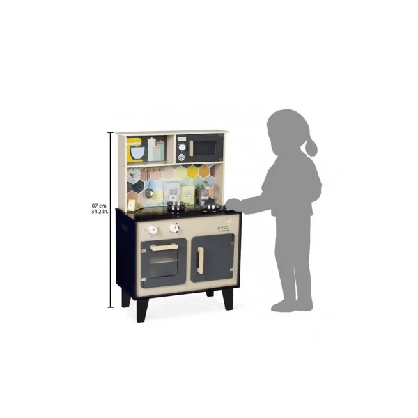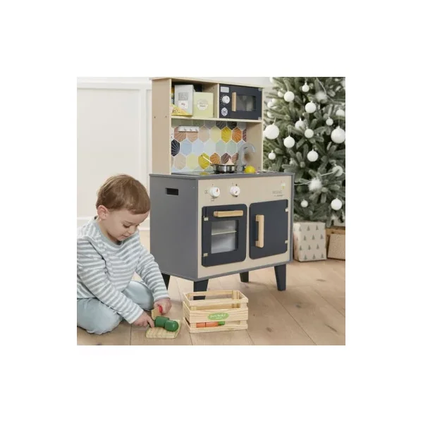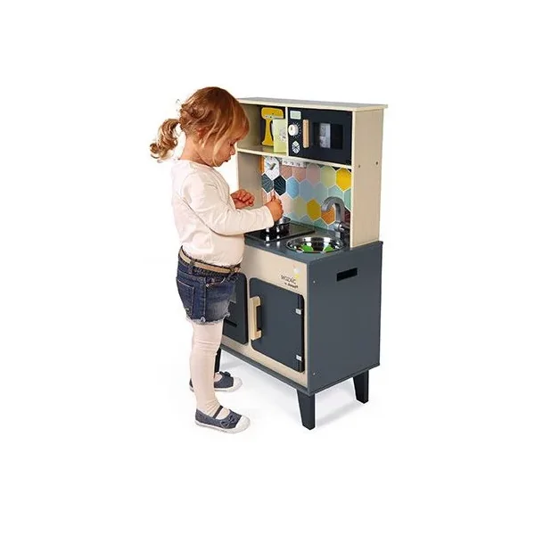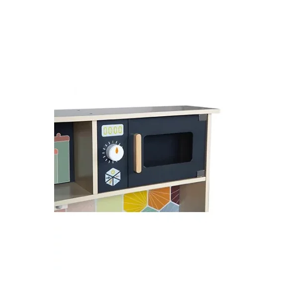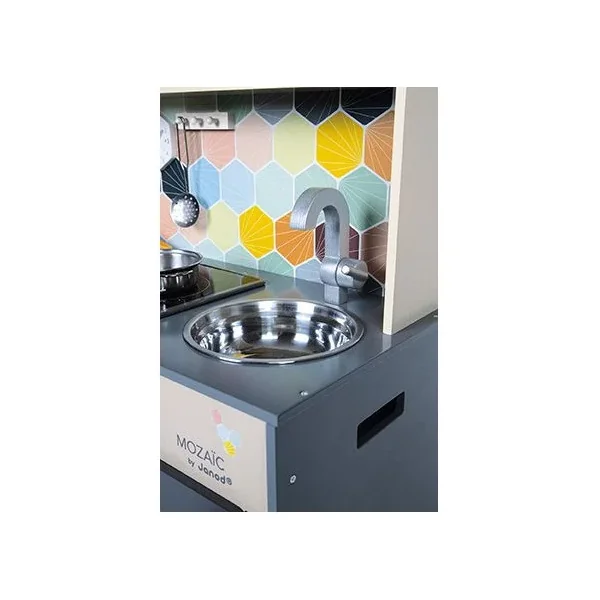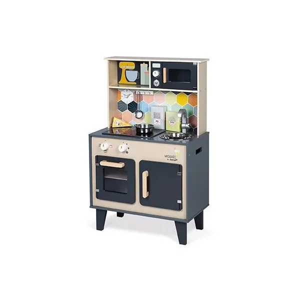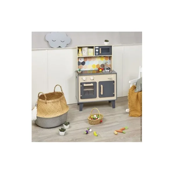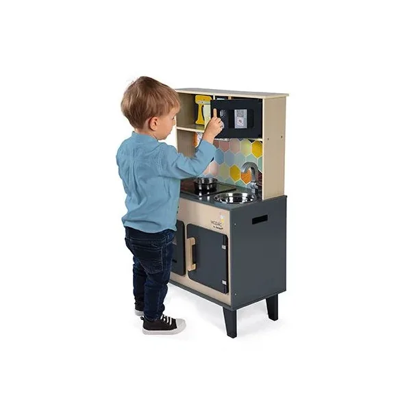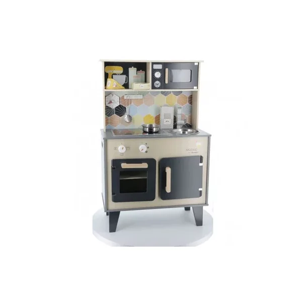 Découvrez la cuisine Mozaïc de Janod, une cuisine en bois pour préparer de bons petits plats. Cette cuisine en bois naturel aux couleurs mixtes et à la crédence ornée d’hexagones, comprend également des accessoires pour cuisinier, ainsi que du son et de la lumière.