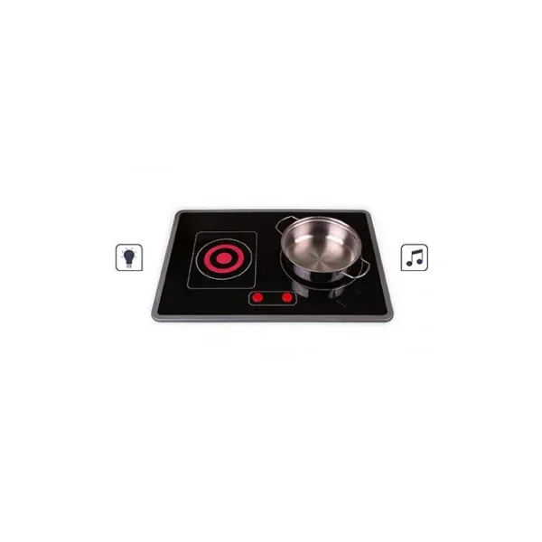 Cette cuisine équipée offre de nombreuses fonctionnalités et des équipements, tels qu’une patère pour suspendre les ustensiles, une casserole en métal et des boîtes d’aliments en carton. Pour allumer les plaques à induction, il vous suffit de tourner les 2 boutons rotatifs avec bruitage. Vous trouverez également un four, un placard avec portes magnétiques, un évier en inox et une horloge.