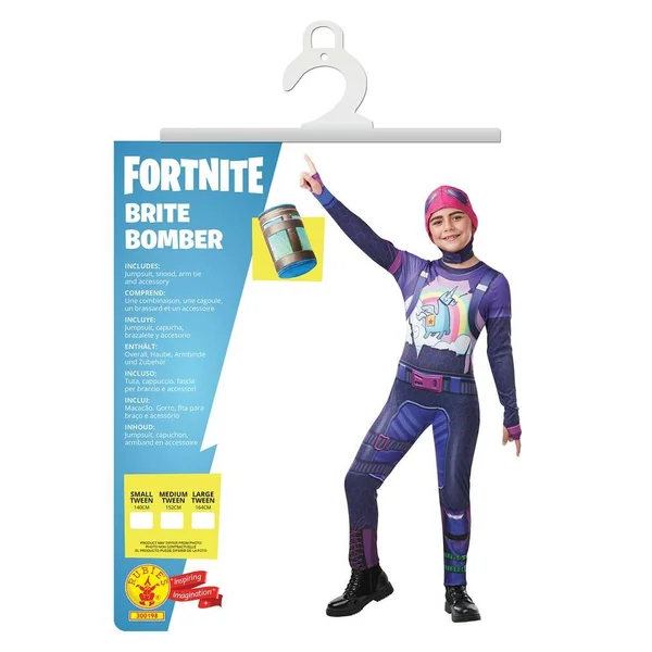 Déguisement Ado Brite Bomber taille XL comprenant une combinaison imprimée avec impression digitale recto-verso, des manches longues imprimées recto-verso, une cagoule en tissu avec impression digitale recto-verso, un brassard en tissu à attacher autour du bras, un couvre-canette Gourde du Brave. Chaussures non fournies.