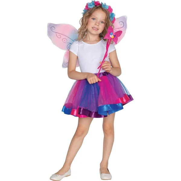 Déguisement de la petite fée. Taille unique – Enfants de 4 à 7 ans. Contient : 1 jupe tutu, 1 paire d’ailes, 1 bandeau couronne de fleurs et 1 baguette. Matière de la jupe tutu : 100 % polyester, lavable en machine à 30° en cycle délicat. Chaussures et tee-shirt non fournis.