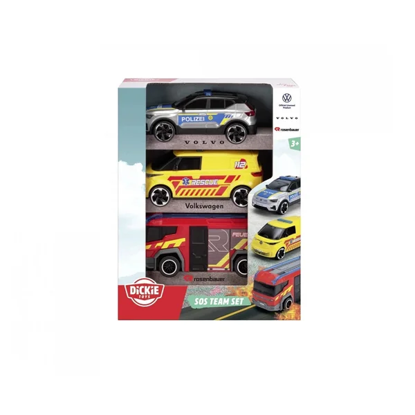 Introducing the Dickie Toys SOS Team Play Vehicle set, a thrilling collection designed to ignite the imagination of young adventurers. This set features three meticulously crafted freewheel cars, each measuring 15 cm, making them perfect for little hands eager to embark on rescue missions. The set includes a Volvo EX40 police car, a VW ID. Buzz ambulance, and a Rosenbauer Penta fire engine, all of which are officially licensed replicas of real-life vehicles. Ideal for children aged three and above, this playset promises endless fun and excitement.